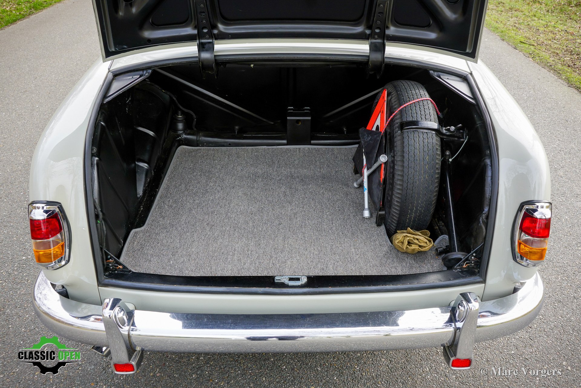 Sous le capot et dans le coffre, tout semble en excellent état. L'intérieur est assurément entièrement d'origine et en très bon état, avec seulement quelques imperfections mineures et une légère décoloration par endroits. Le compteur affiche 22 697 kilomètres, et l'on pense que le kilométrage réel est de 122 697 km. Au vu de l'usure des pédales et d'autres détails, cela paraît plausible. La conduite est confortable et agréable ; on se sent parfaitement maître de la situation derrière le grand volant et l'élégant tableau de bord.