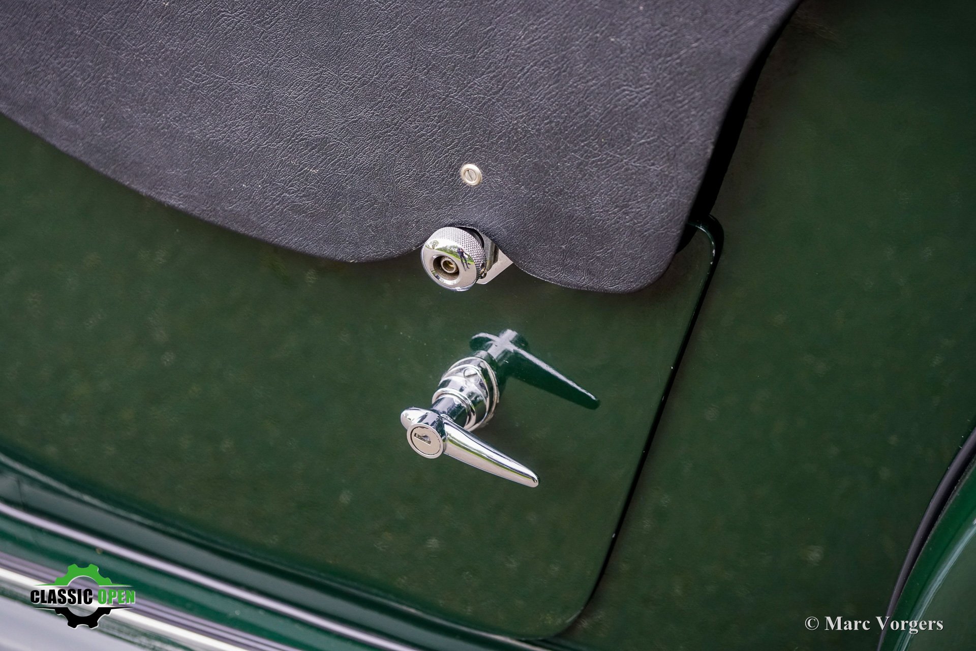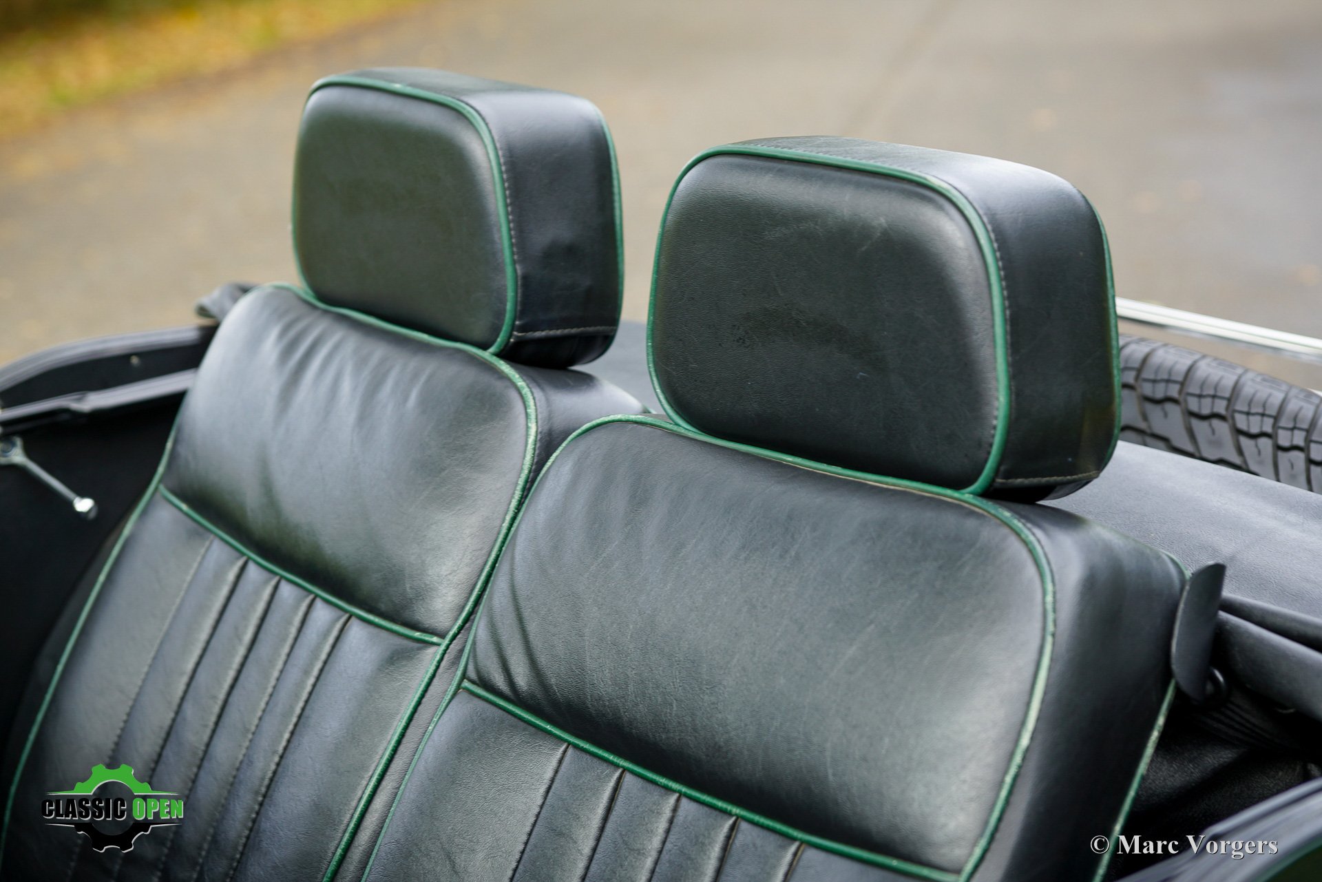 Carrosserie finition British Racing Green, capote et couvre-tonneau en vinyle noir. Intérieur cuir noir agrémenté de passepoils verts et de moquette noire. Cette magnifique Morgan 4/4 a été vendue aux Pays-Bas et a parcouru 81 000 kilomètres depuis sa sortie d'usine.