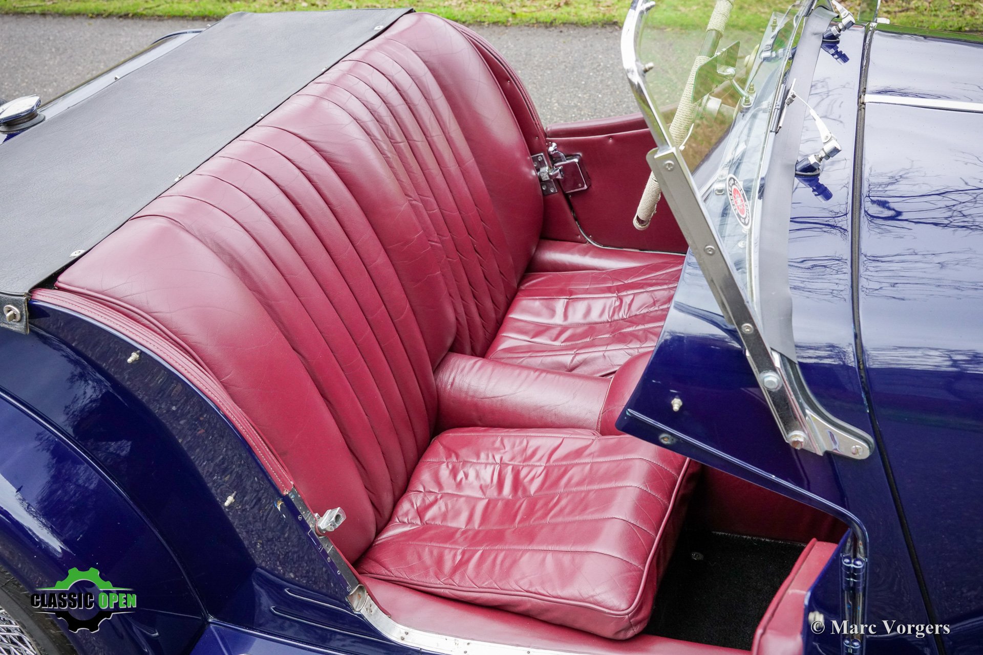 La voiture est équipée d'un équipement grand froid noir comprenant une capote souple, des vitres latérales en cadres aluminium et un couvre-tonneau. La Morgan Plus 4 « bustle back » est le modèle Plus 4 le plus rare en raison de sa carrosserie de transition, avec son arrière plus vertical, dans le style des années 1930.
