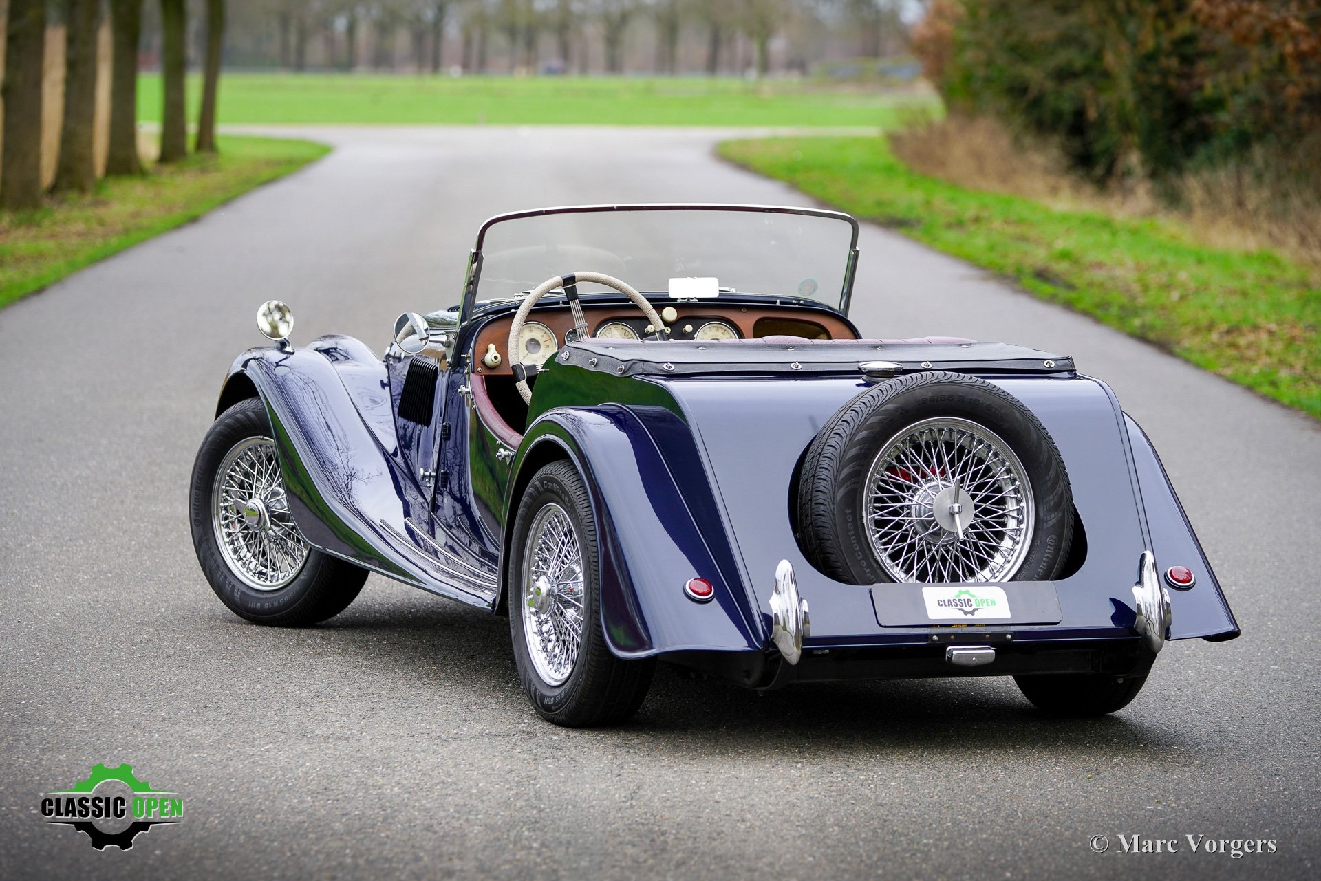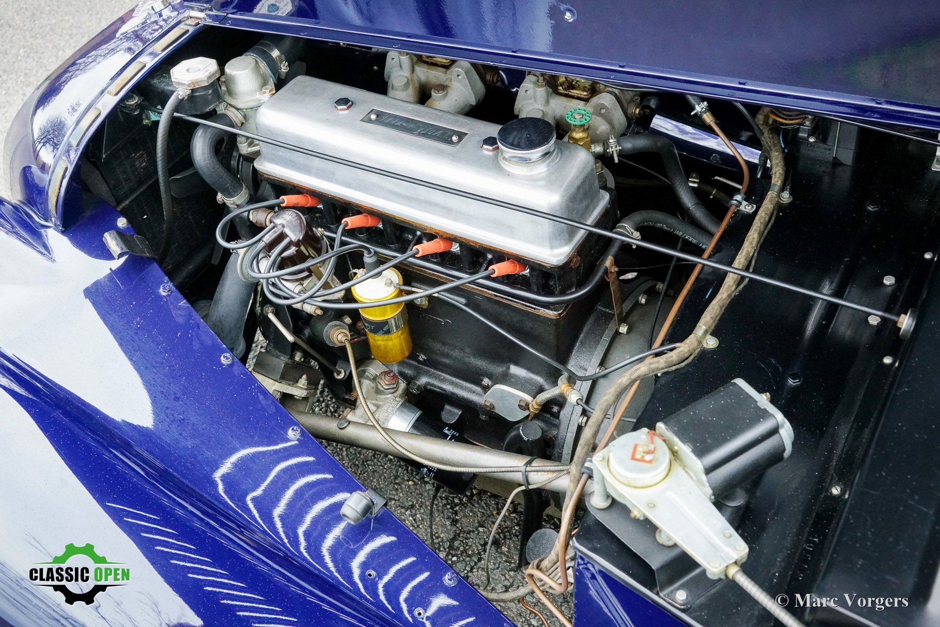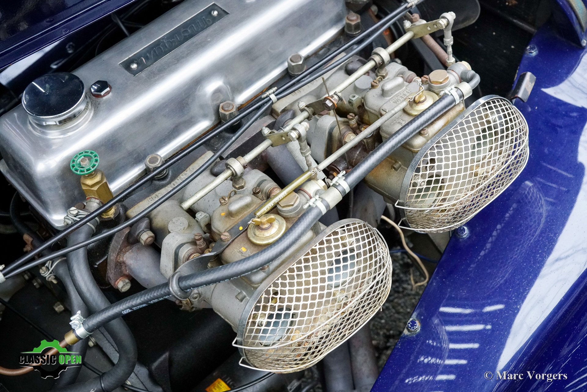 Ce dernier est le bloc d'origine de la Triumph TR3, équipé de deux carburateurs Weber double corps (42 DCOE). Les carburateurs et leurs filtres à air sont parfaitement logés sous un renflement spécifique sur le côté droit du capot.