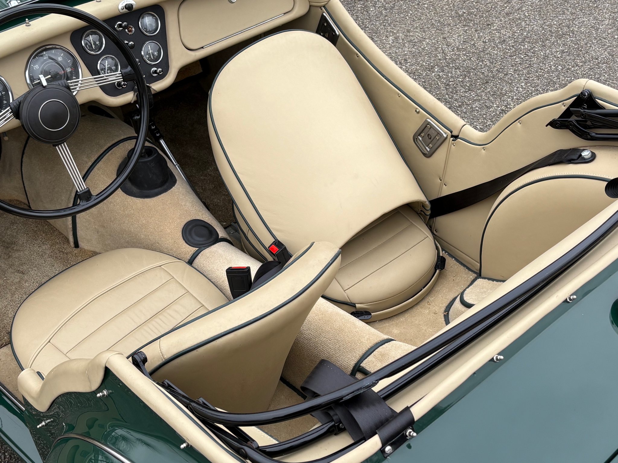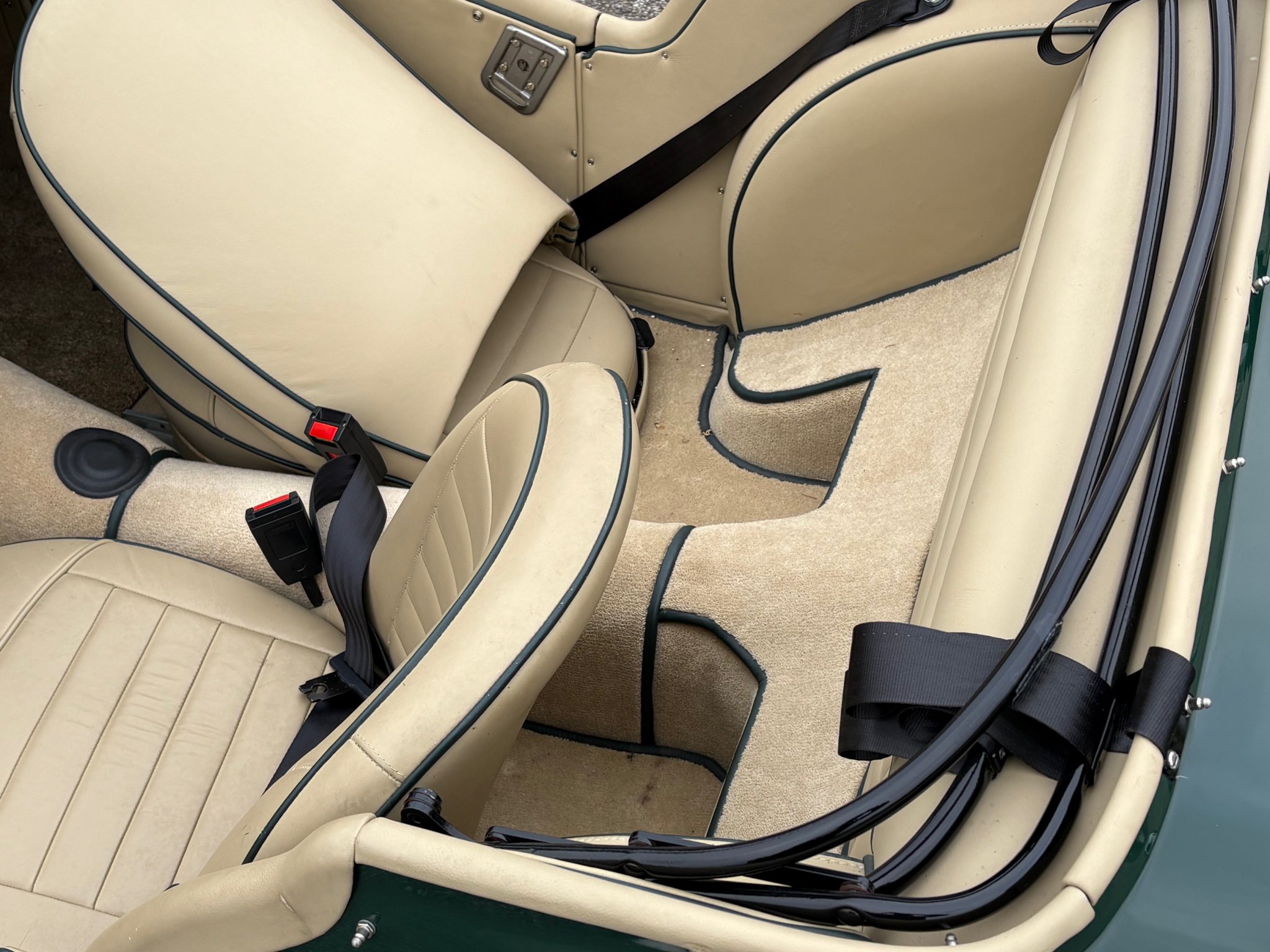 Vert anglais (British Racing Green) avec intérieur cuir beige et capote beige.
