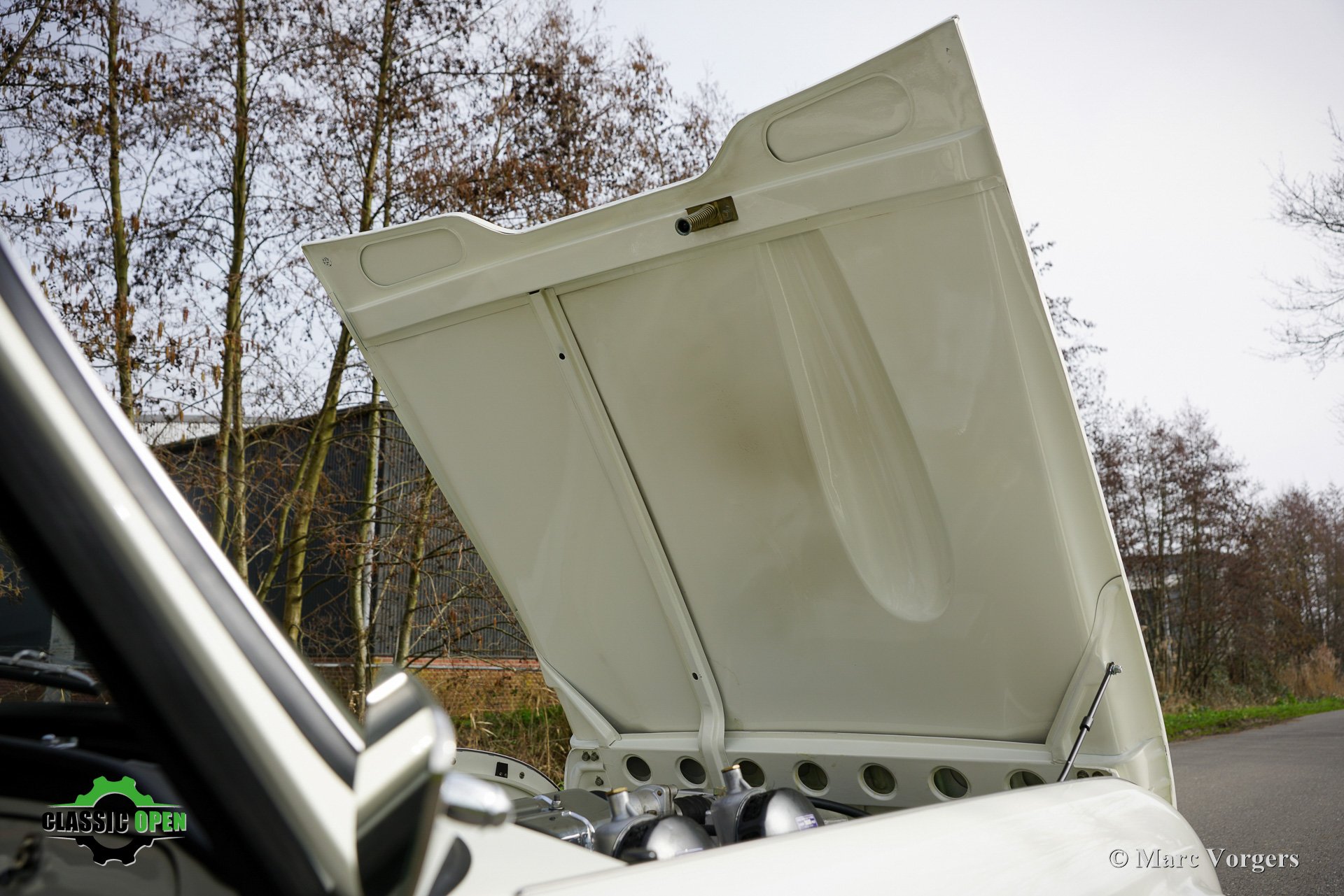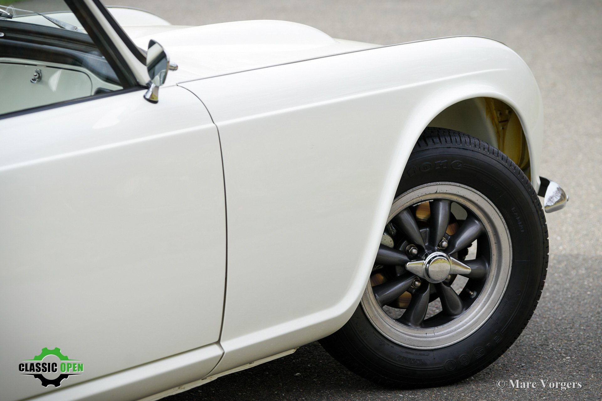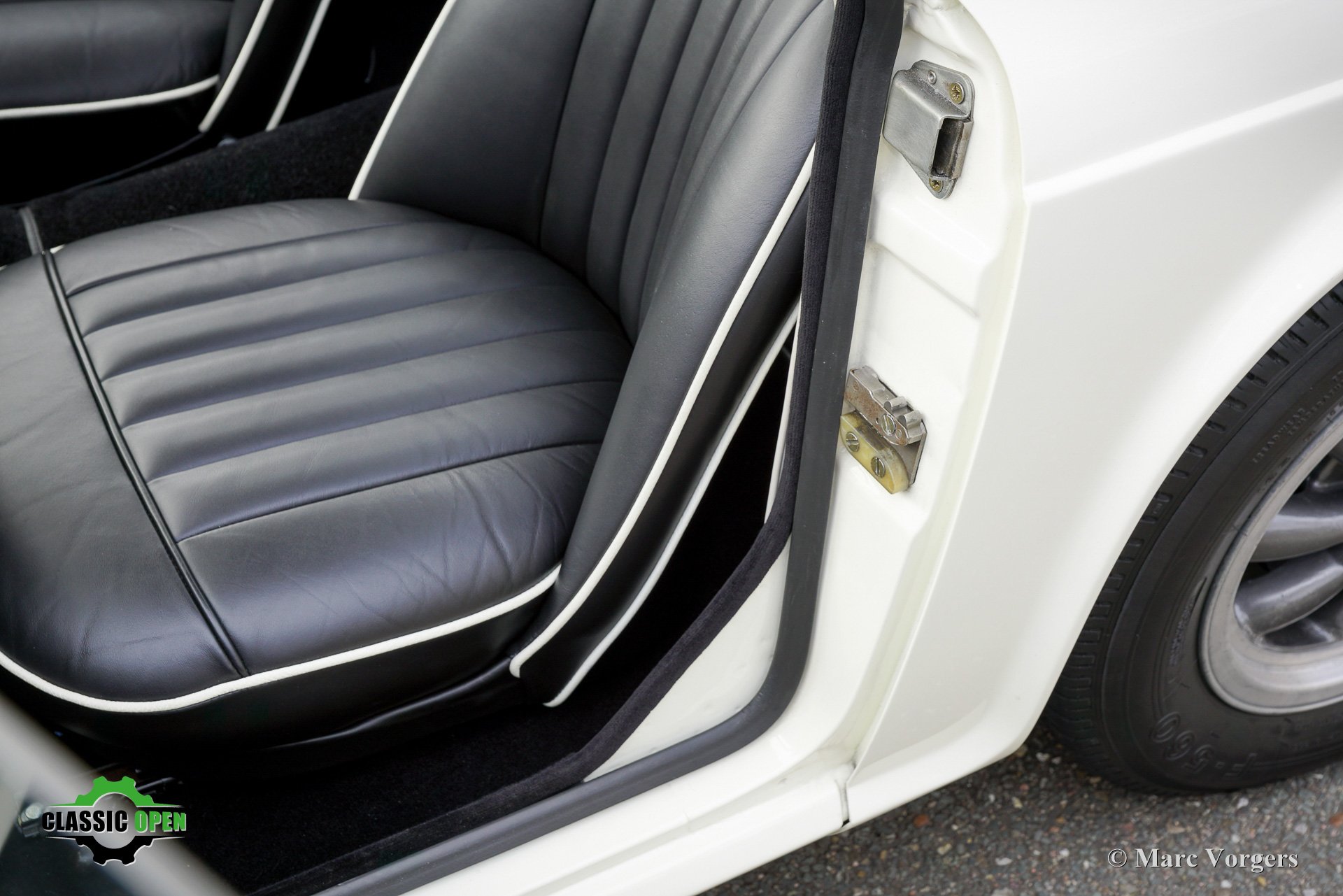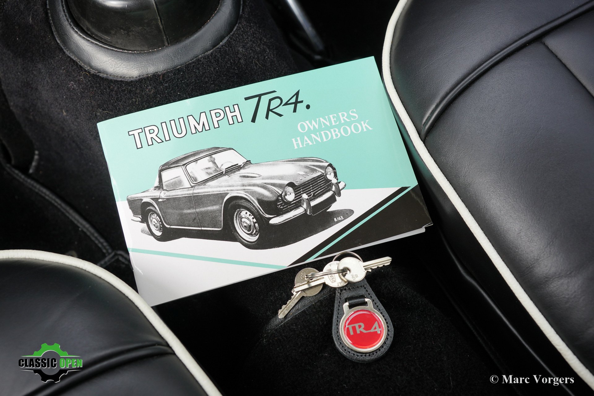 Carrosserie couleur blanc (Spa White). Intérieur noir avec sièges en cuir noir passepoilé blanc et moquette noire. Cette magnifique Triumph TR4 fut entièrement et superbement restaurée et remise à neuf ces dernières années.