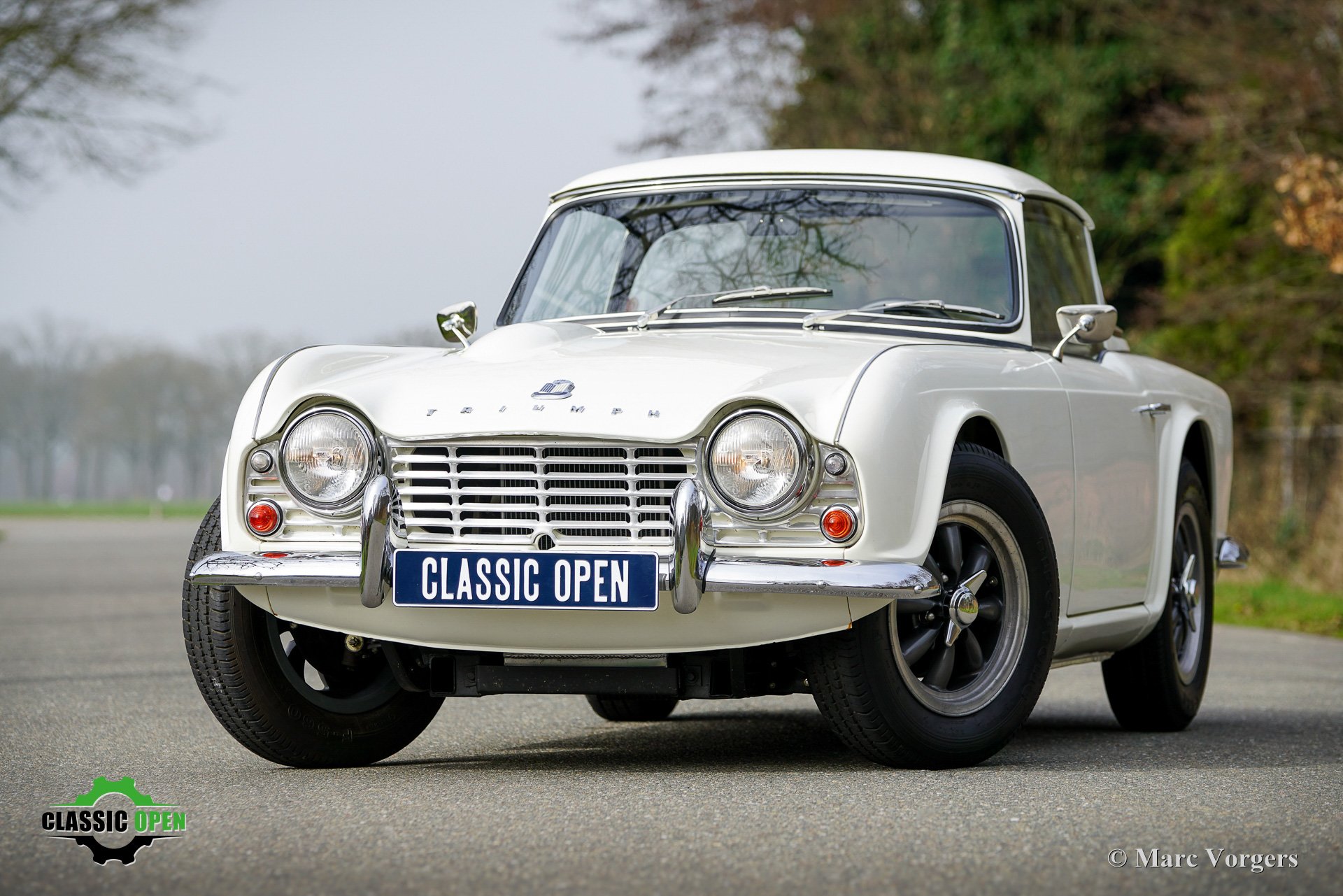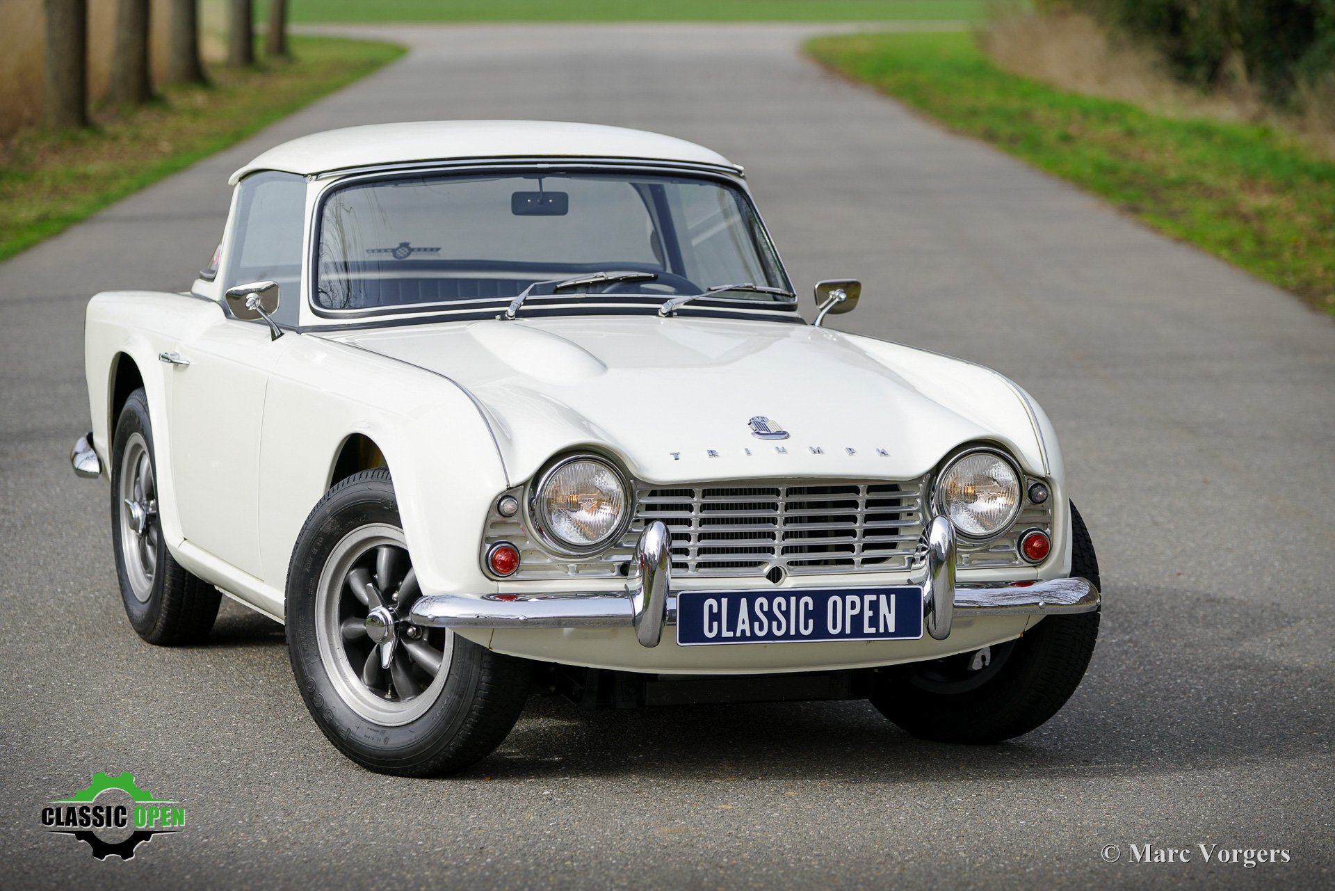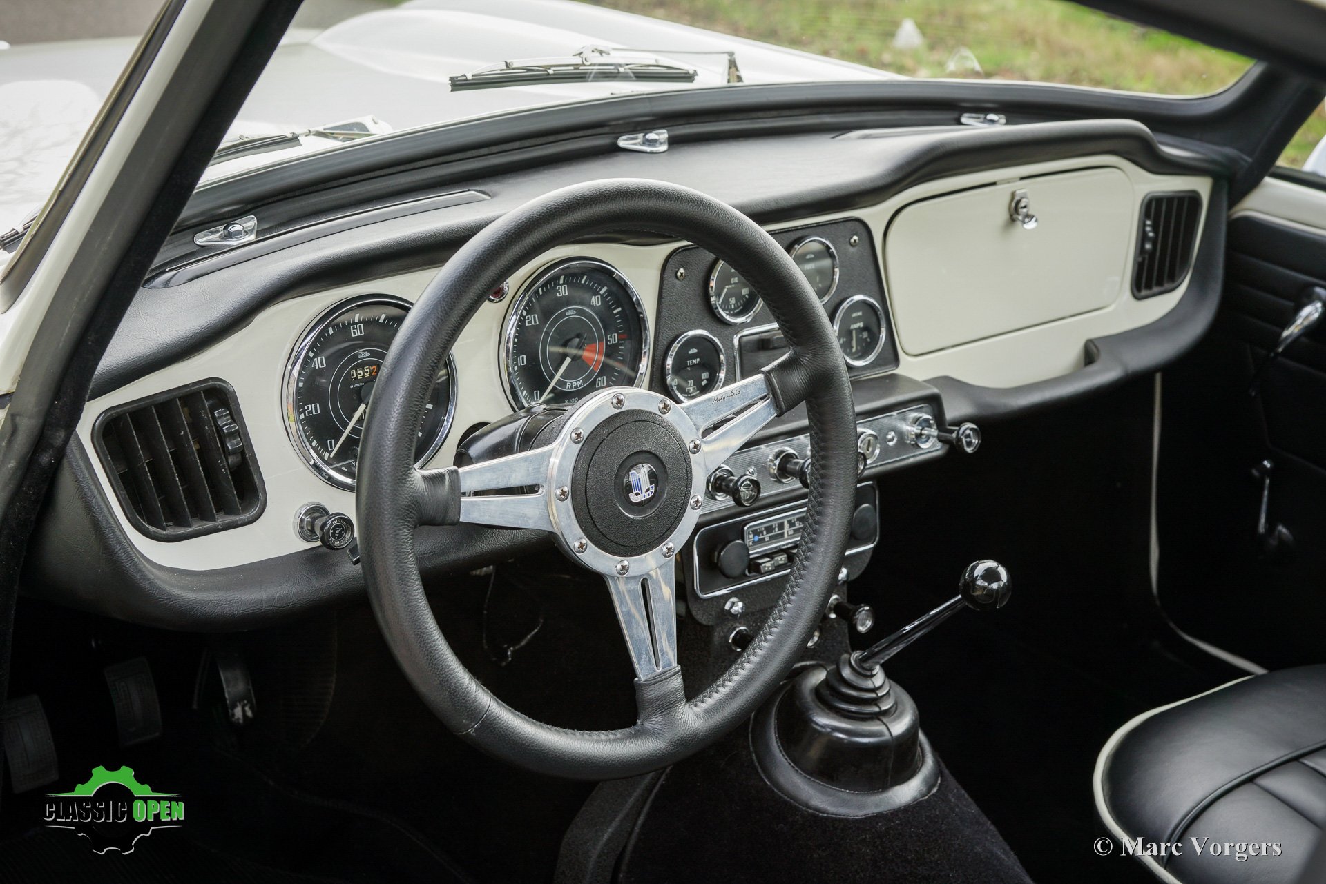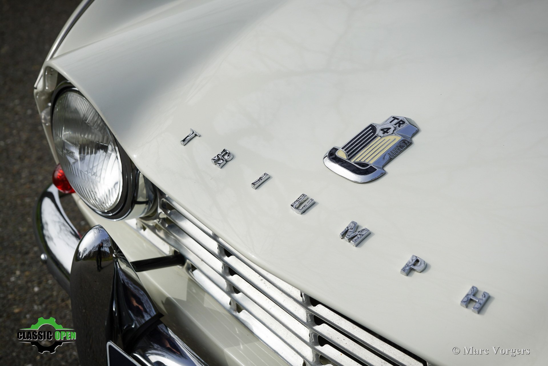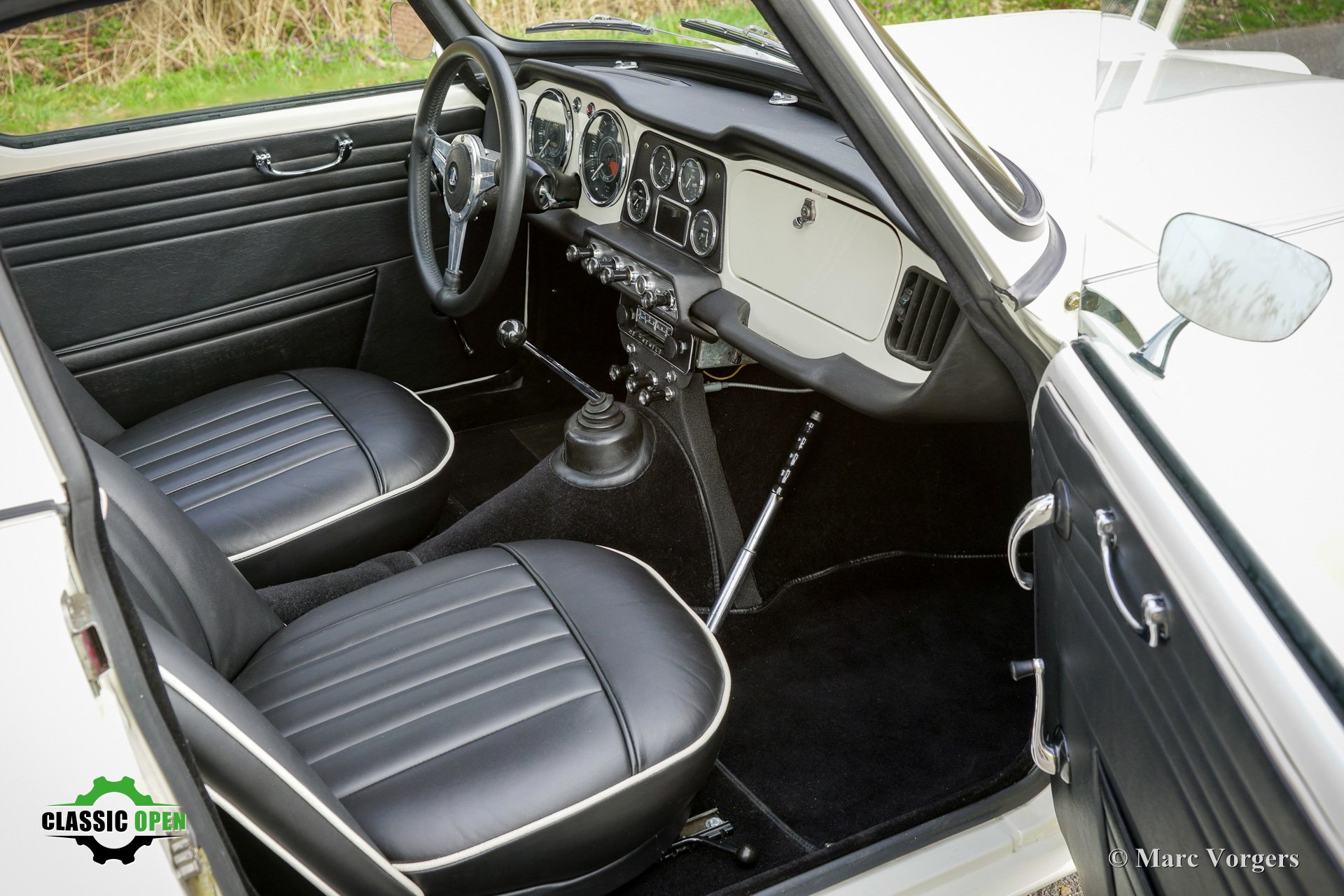 Carrosserie couleur blanc (Spa White). Intérieur noir avec sièges en cuir noir passepoilé blanc et moquette noire. Cette magnifique Triumph TR4 fut entièrement et superbement restaurée et remise à neuf ces dernières années.