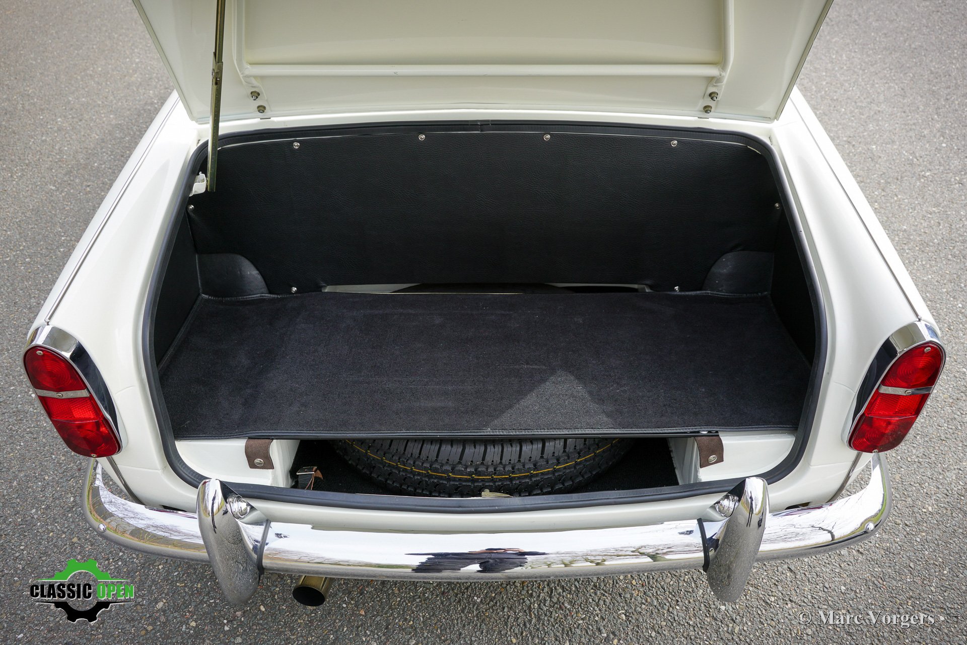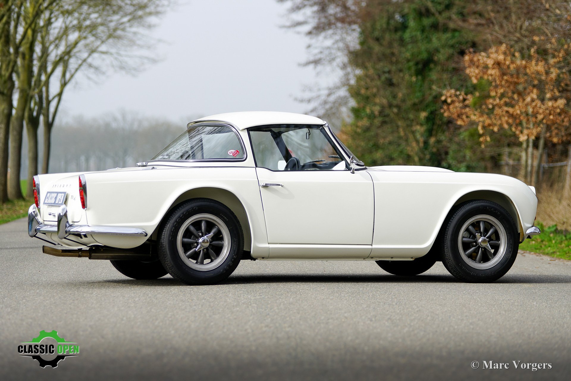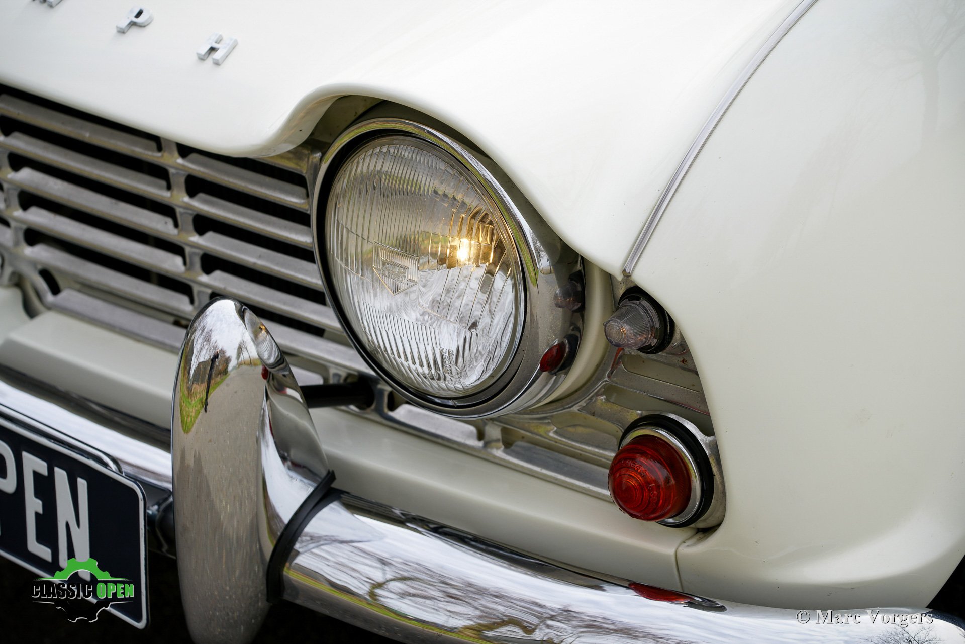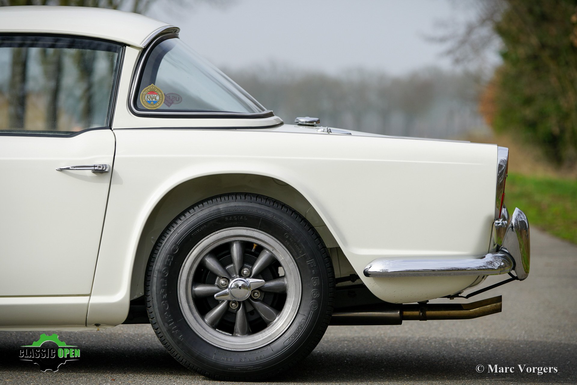 Carrosserie couleur blanc (Spa White). Intérieur noir avec sièges en cuir noir passepoilé blanc et moquette noire. Cette magnifique Triumph TR4 fut entièrement et superbement restaurée et remise à neuf ces dernières années.