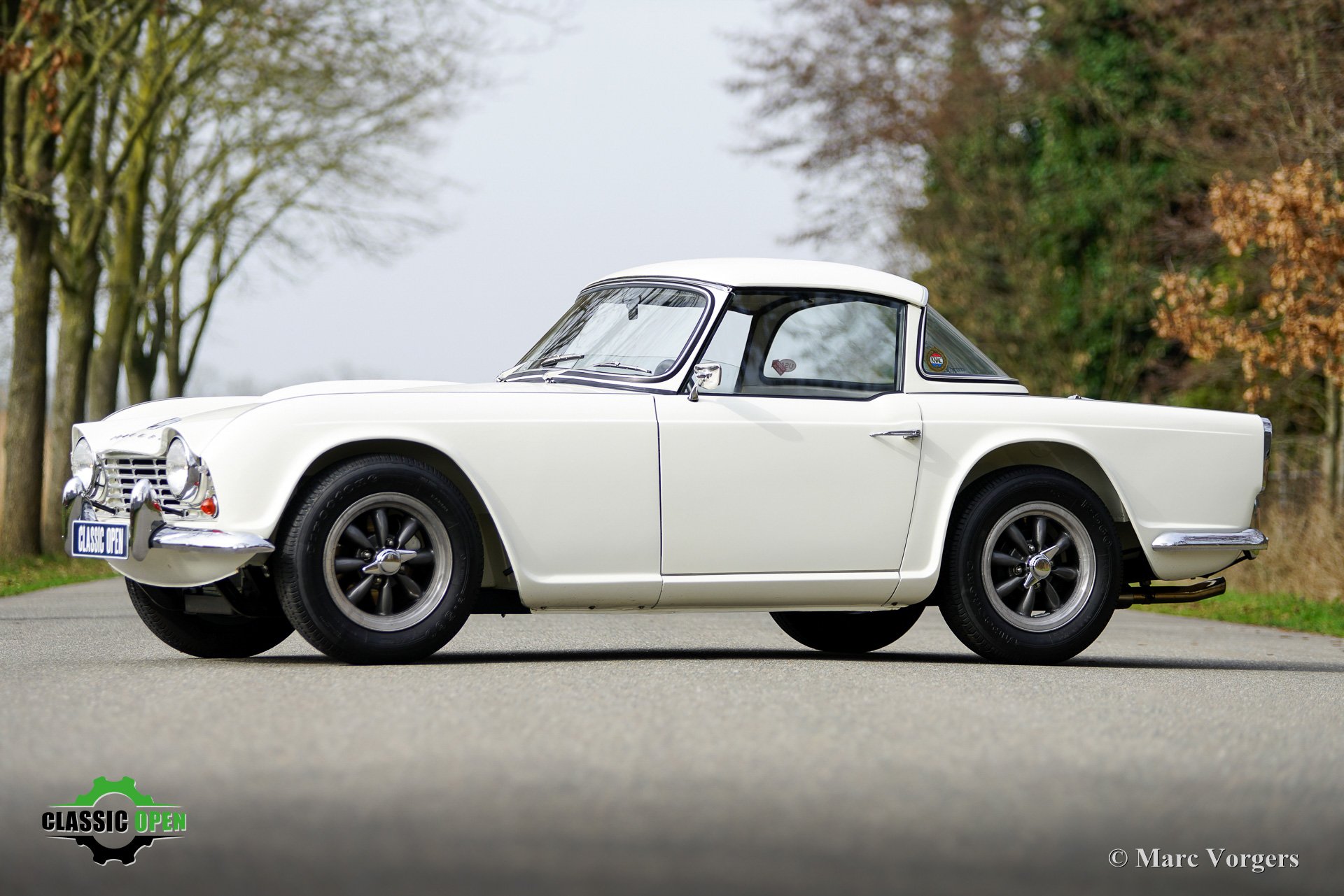 Cette TR4 est équipée de deux options d'époque très recherchées. Tout d'abord, un toit rigide « Surrey Top » avec son panneau intégré, interchangeable avec la capote souple en vinyle repliable rangée dans le coffre. Le Surrey Top a inspiré Porsche pour la création des 911/912 Targa.