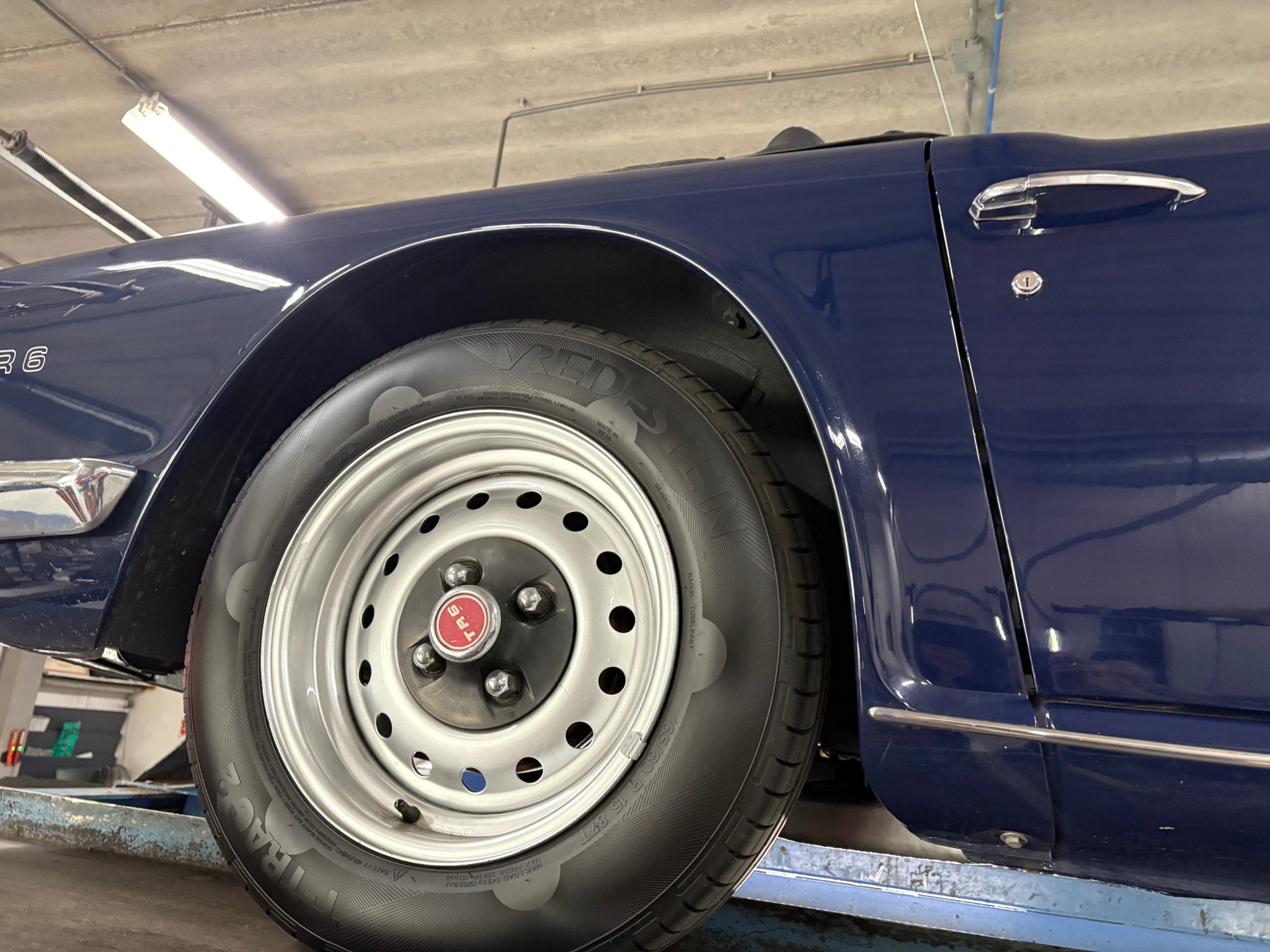 Capote en mohair bleu et couvre-capote en vinyle noir. Il s'agit d'une rare et recherchée Triumph TR6 PI aux spécifications européennes, équipée du système d'injection mécanique Lucas.